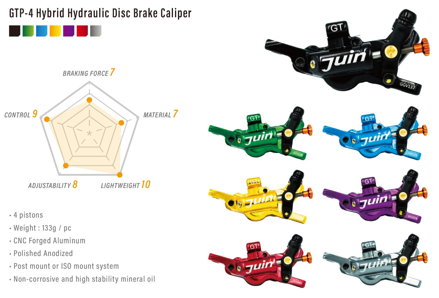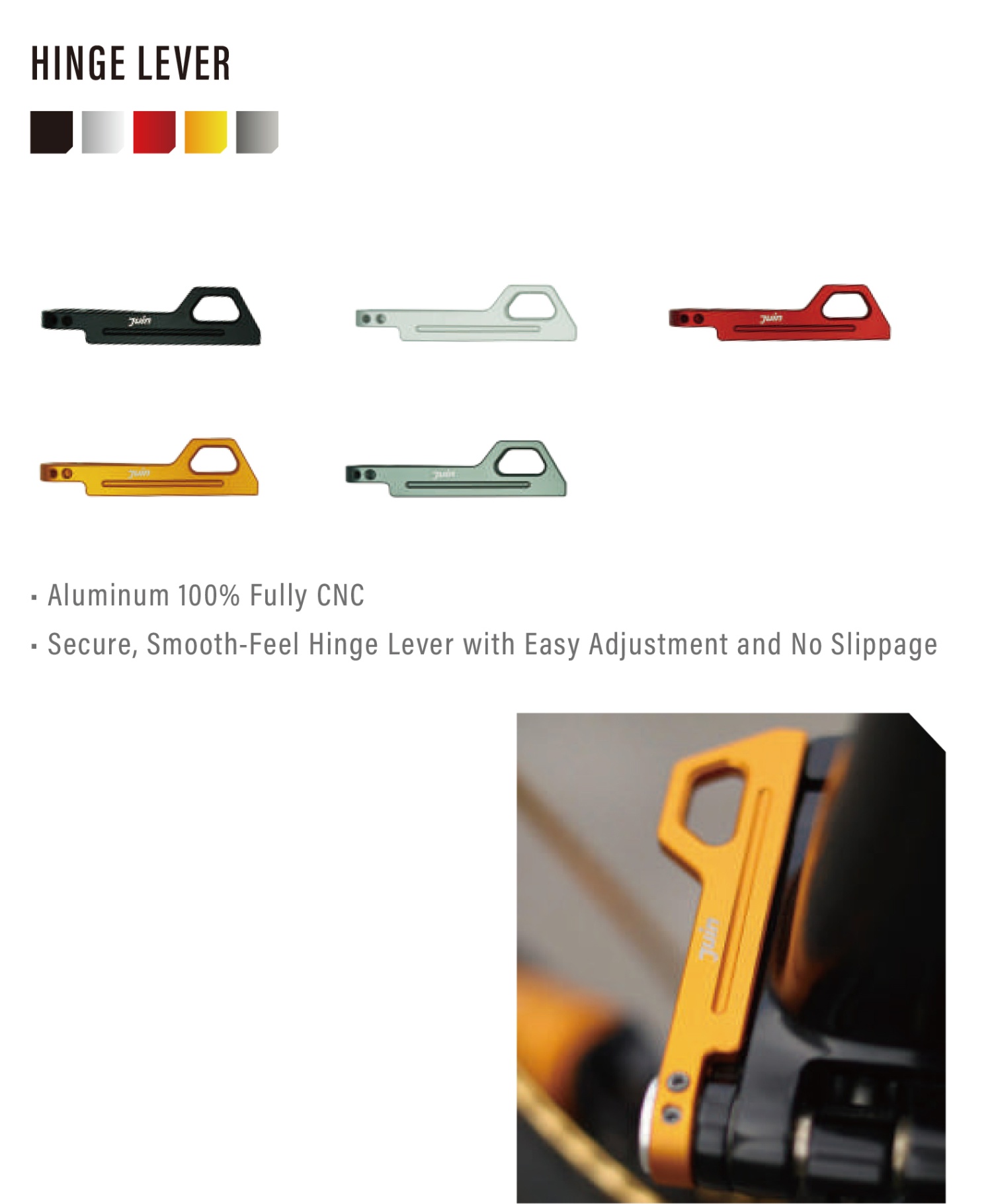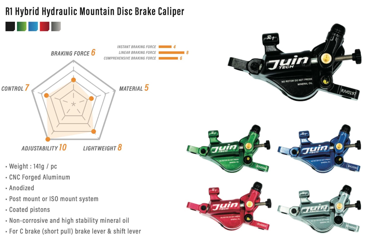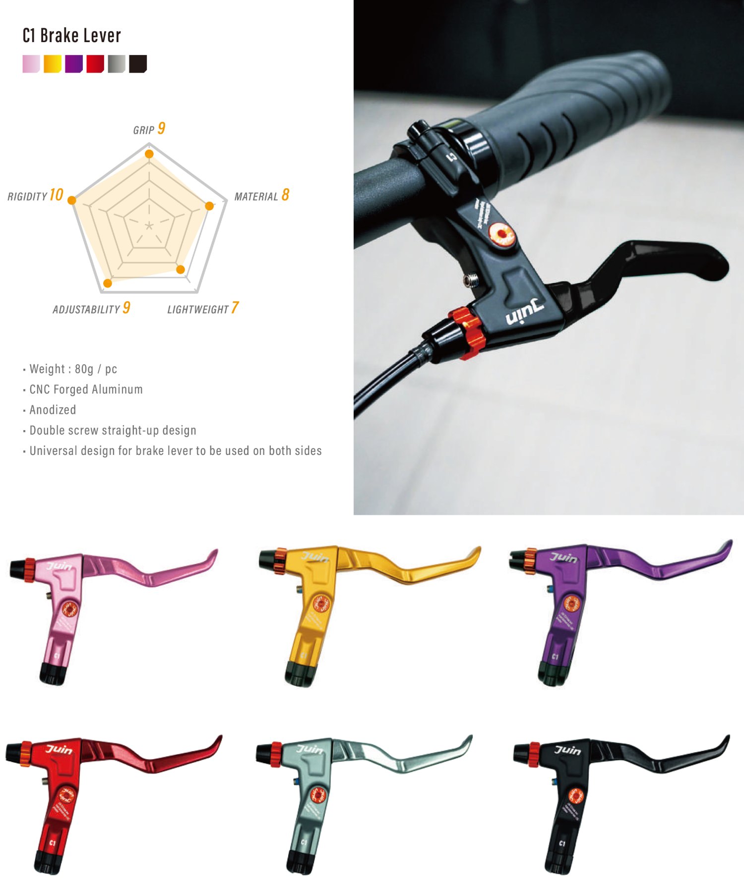JuinTECH C1專為線傳油碟卡鉗設定的行程,是一組能提供最佳手感與制動力道的頂級煞把,本體為鍛造鋁合金加上CNC切割,單邊重量僅80g