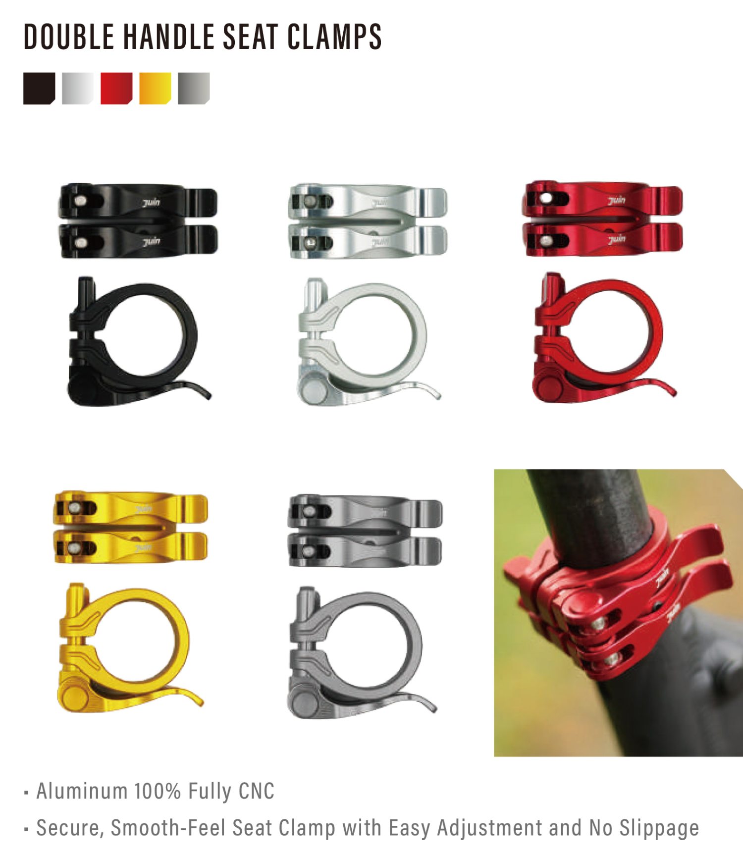 JuinTECH改良了傳統結構,讓單柄管束拿來當座管束就能有足夠的咬合能力,不只操作輕鬆還不會讓座管下滑喔!