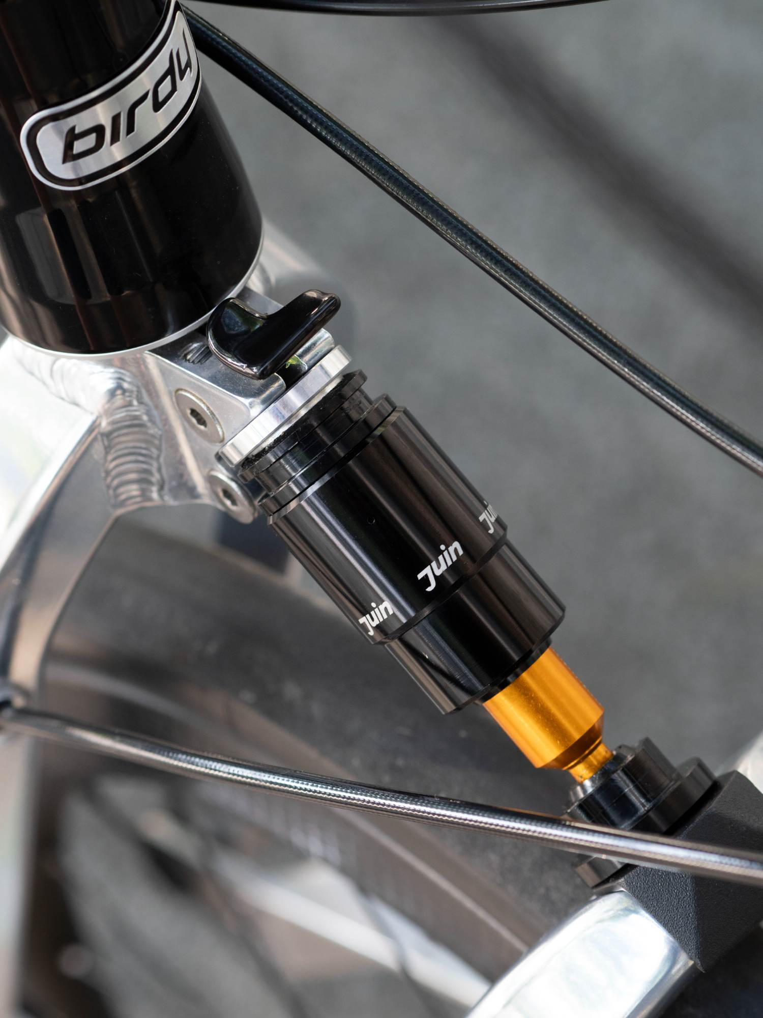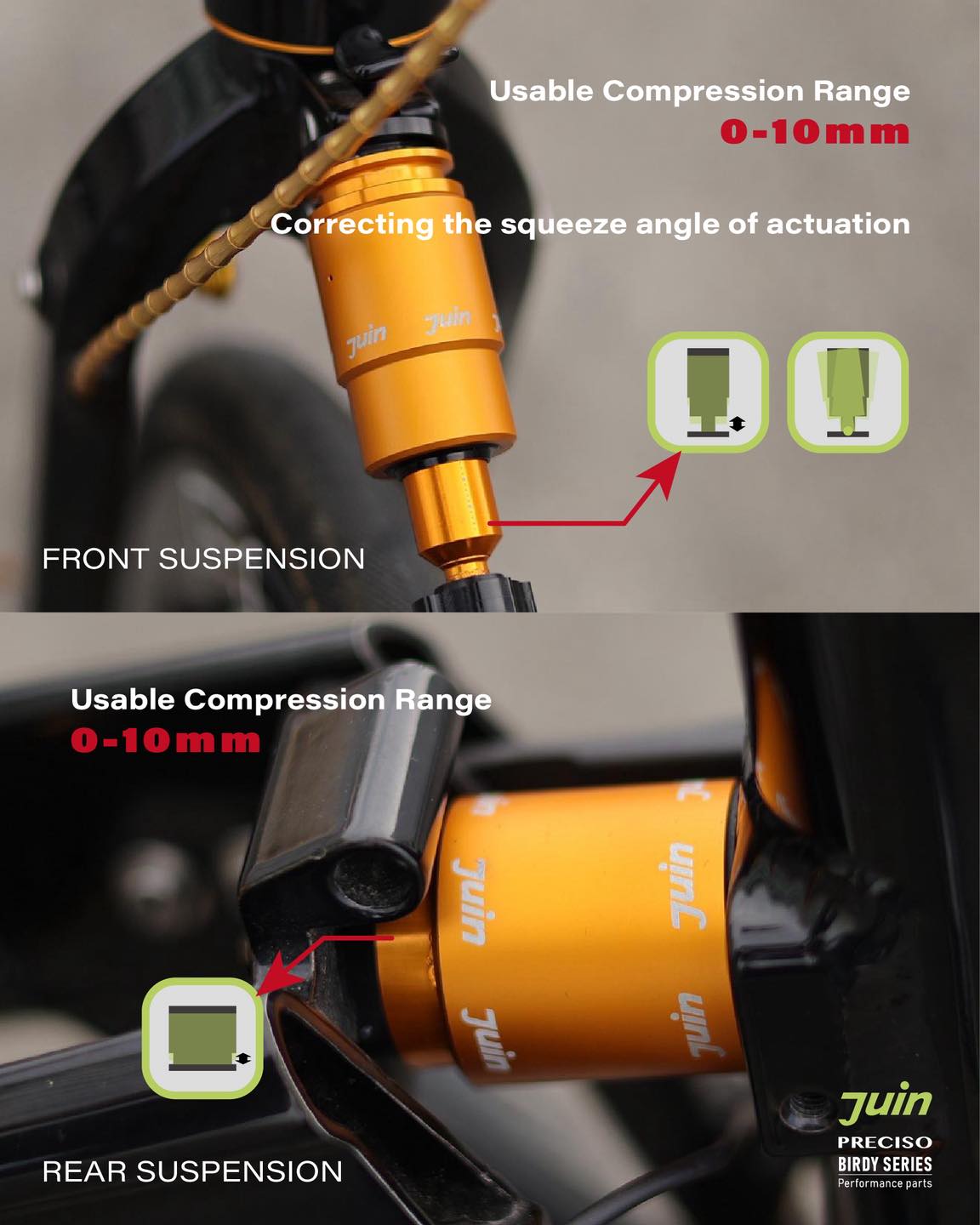 JuinTECH避震器系統採用油壓/彈簧/優力膠的混合式阻尼,我們有實際騎乘過升級避震器的車,心得感想:「路面的震動明顯減輕,騎著 BIRDY...更像是貼地飛行了!」