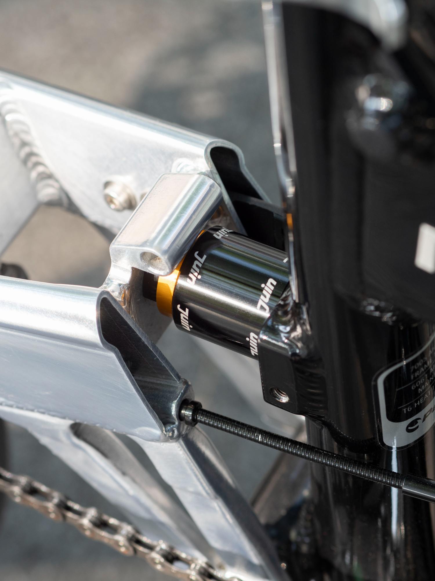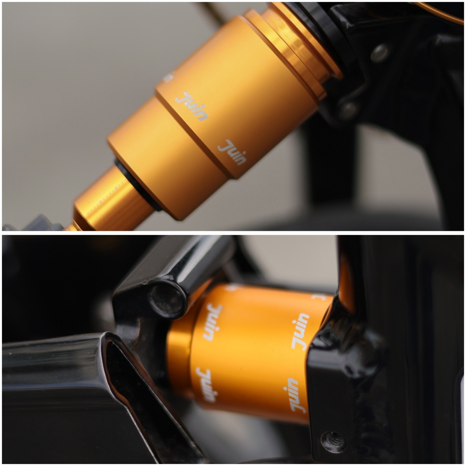 為了讓避震器能跟隨前叉的弧形潰縮運作而保持切線角度,JuinTECH以汽機車的懸吊機構為靈感,首創設計了前後兩個萬向球頭,成為一個迷你的連桿結構。