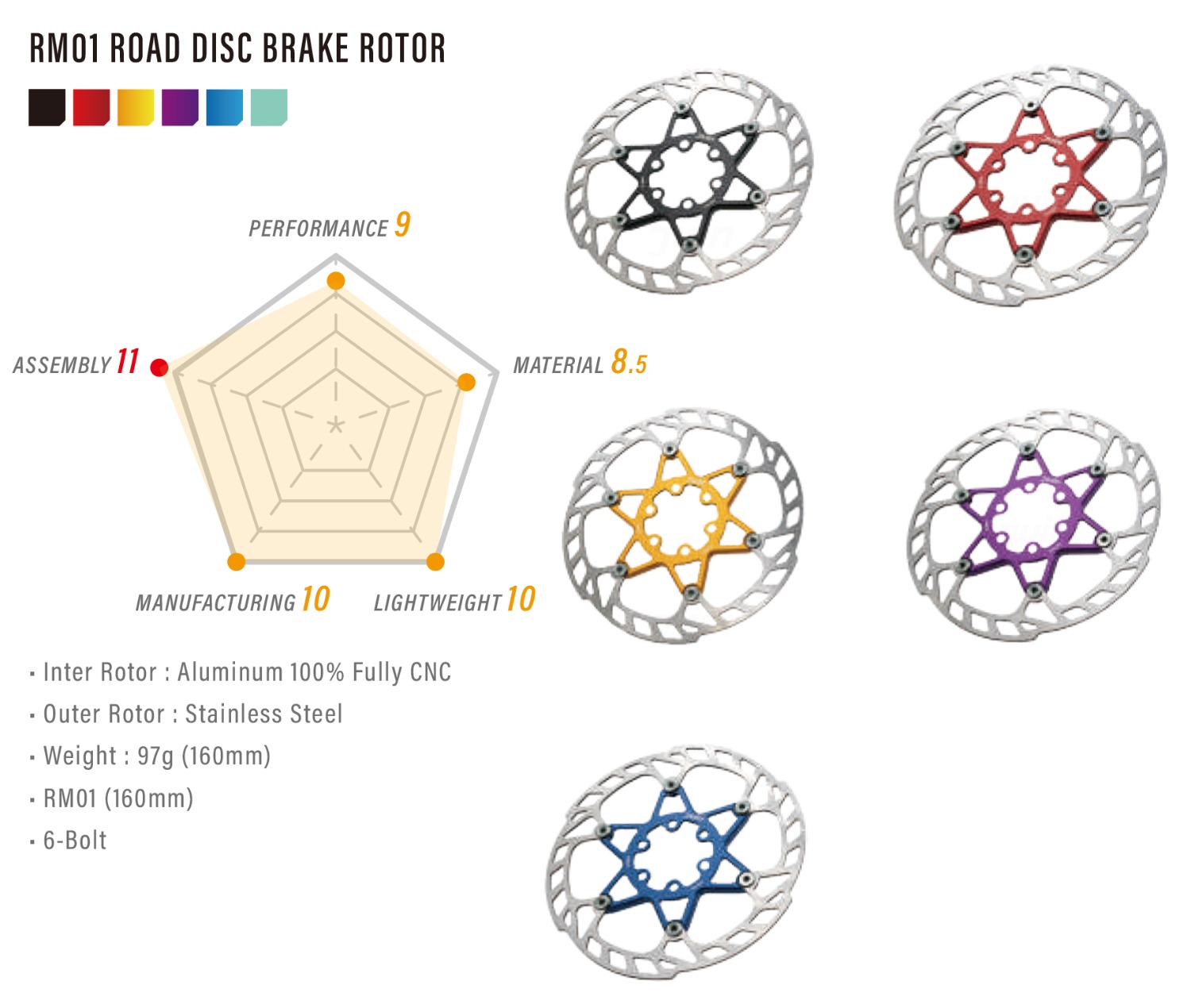 在 BIRDY使用的國際六孔規格,其型號為 RM01,重量也下降到97g!只是,現在你不再只有黑色的碟盤可以選了,JuinTECH給你更多顏色能讓你裝飾愛車!
