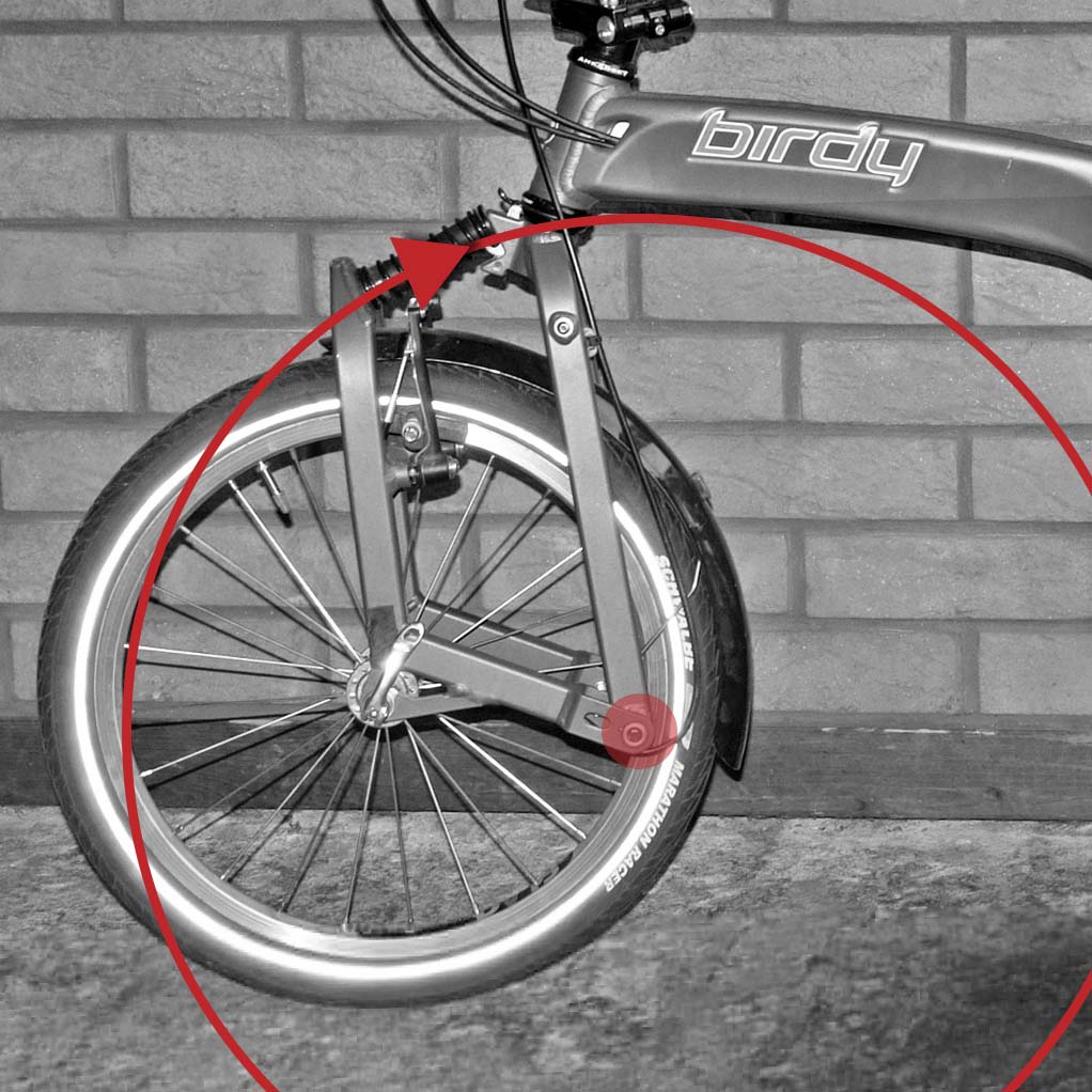 BIRDY改裝上還有一個「困難點」,是因為 BIRDY縱向轉軸的前後叉結構,避震潰縮運作的方向為圓弧而非直線,這也相當考驗避震器的設計。也因此,你就能知道為什麼原廠的前避震器會是多向彈簧的機構,是個正確的考量!(of course!)
