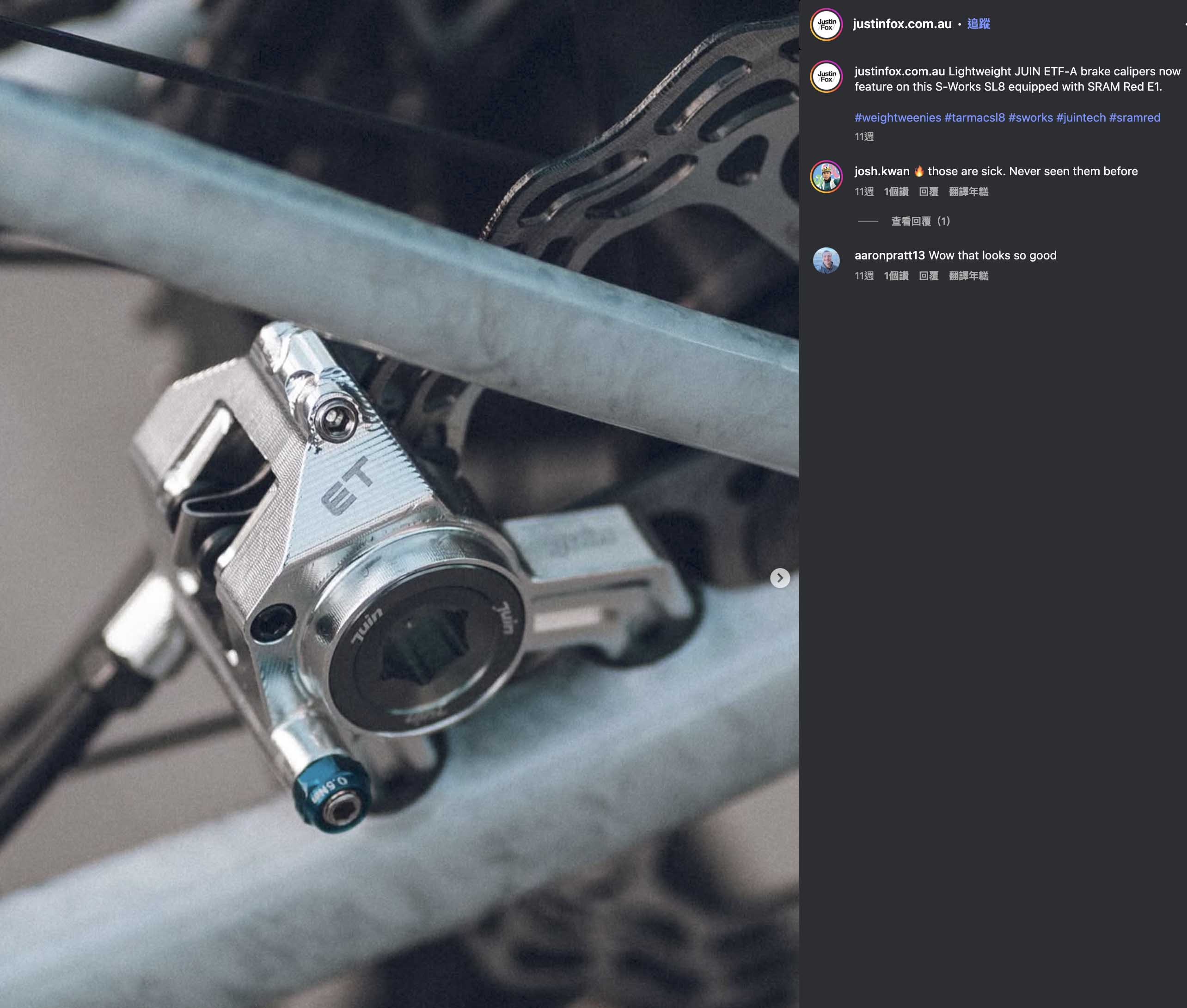 目前台灣公路車在碟煞系統升級最多,安裝範例最豐富的,必推嘉義扛壩子的 MR.BIKE單車先生莫屬了,fb臉書上的美車範例超多,若你有興趣,推薦可以去看看喔!瓜瓜老闆可是我們 JuinTECH的安裝技術指導師傅!せんせいです!