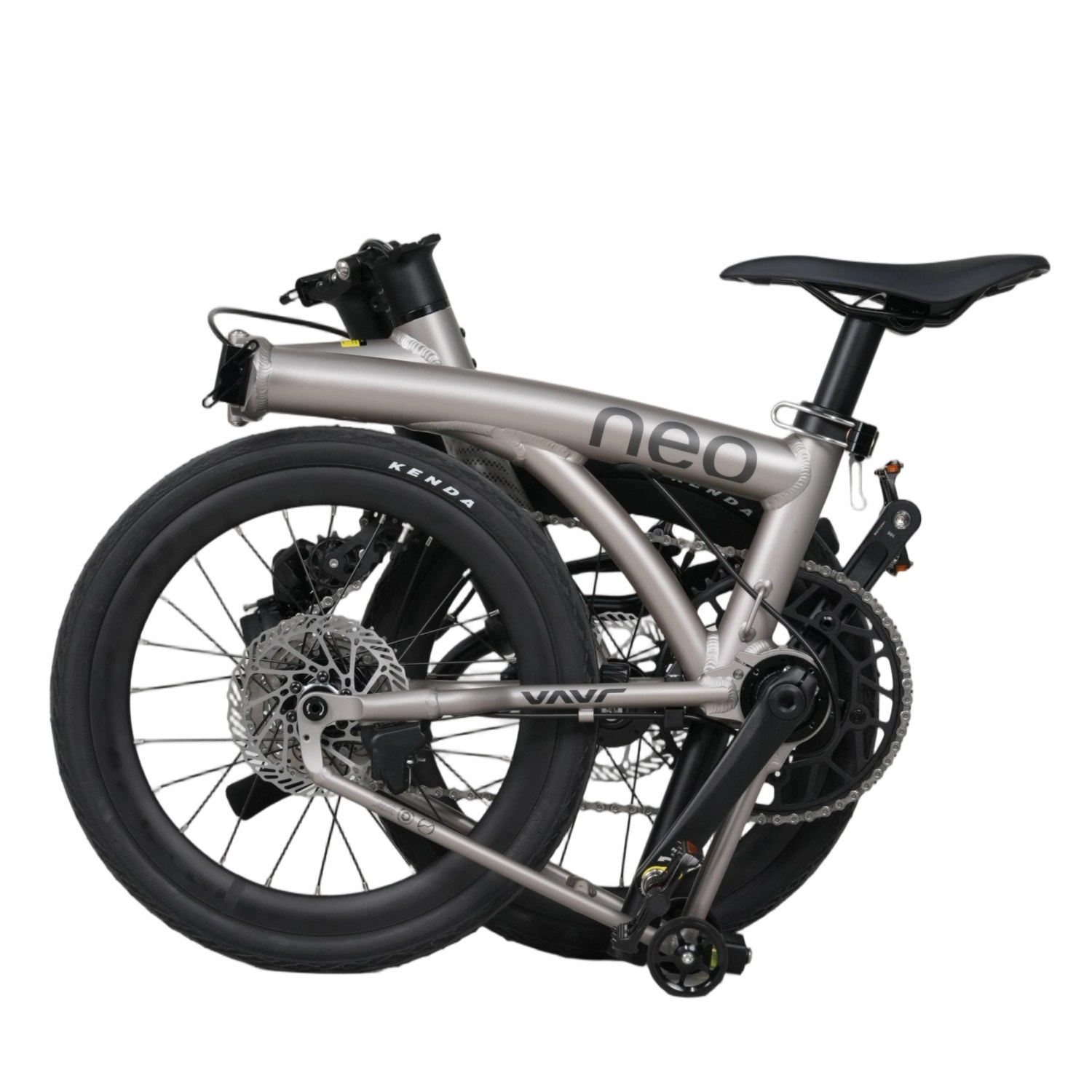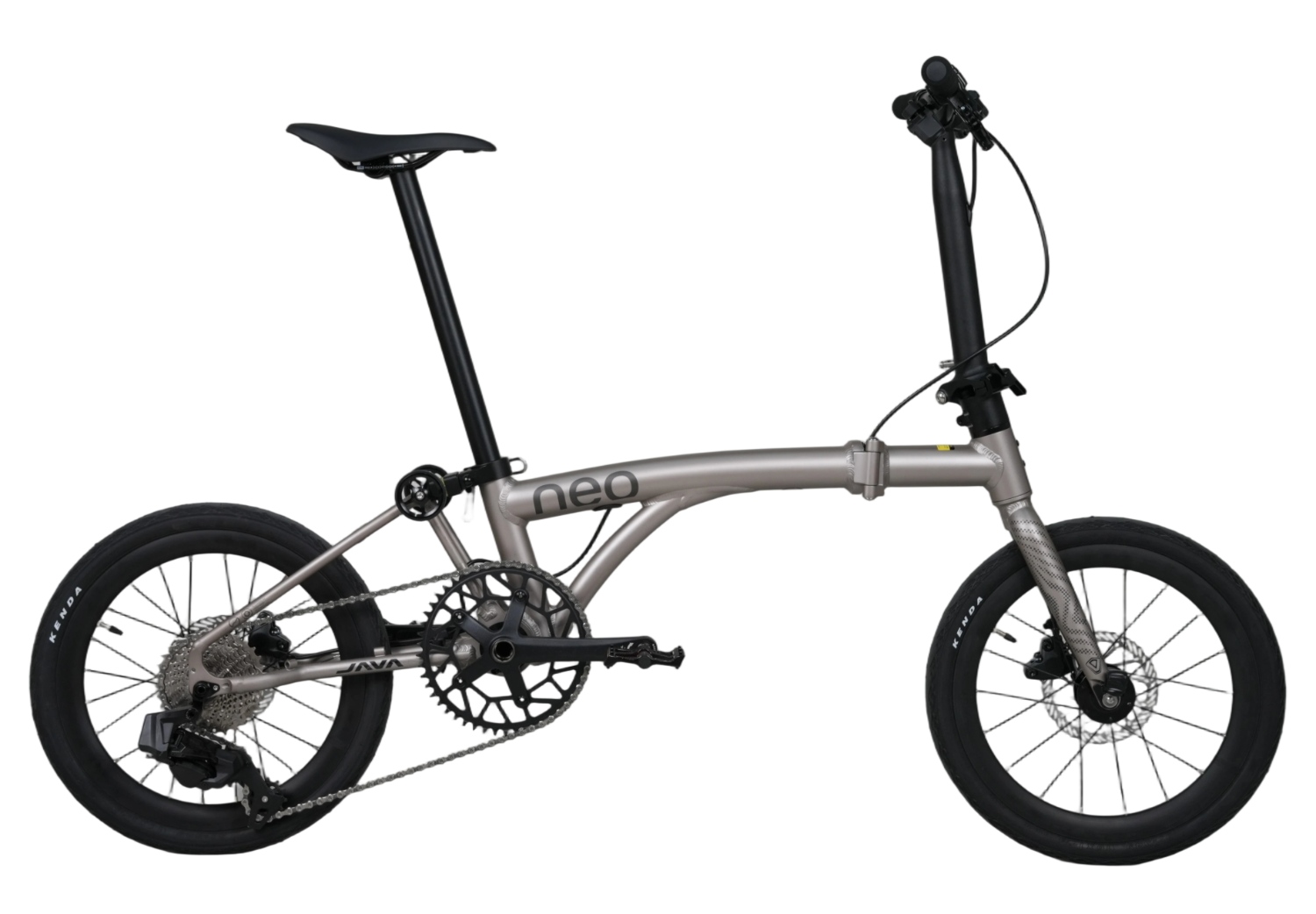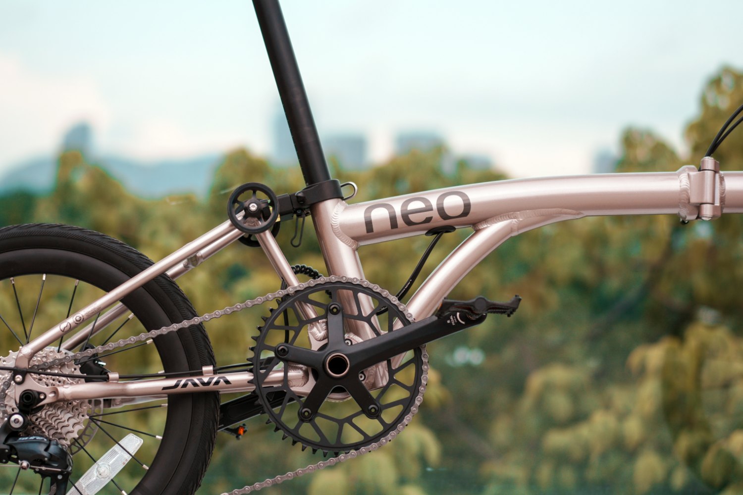 JAVA設計師將原本傳統三摺車的後三角結構小轉軸,直接與大盤軸心二合一,以機械結構來說...JAVA NEO的大軸設計會更為比較強壯!