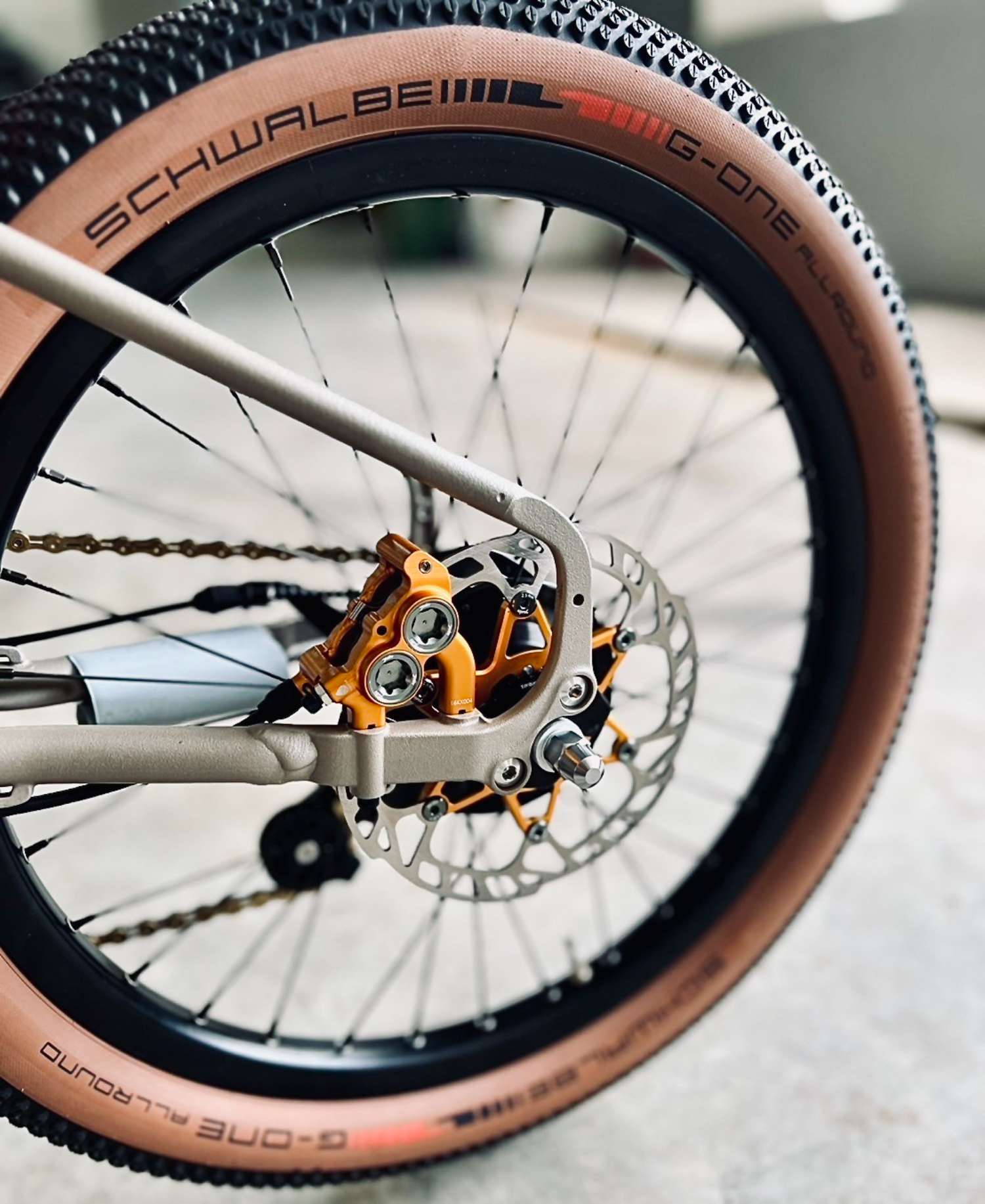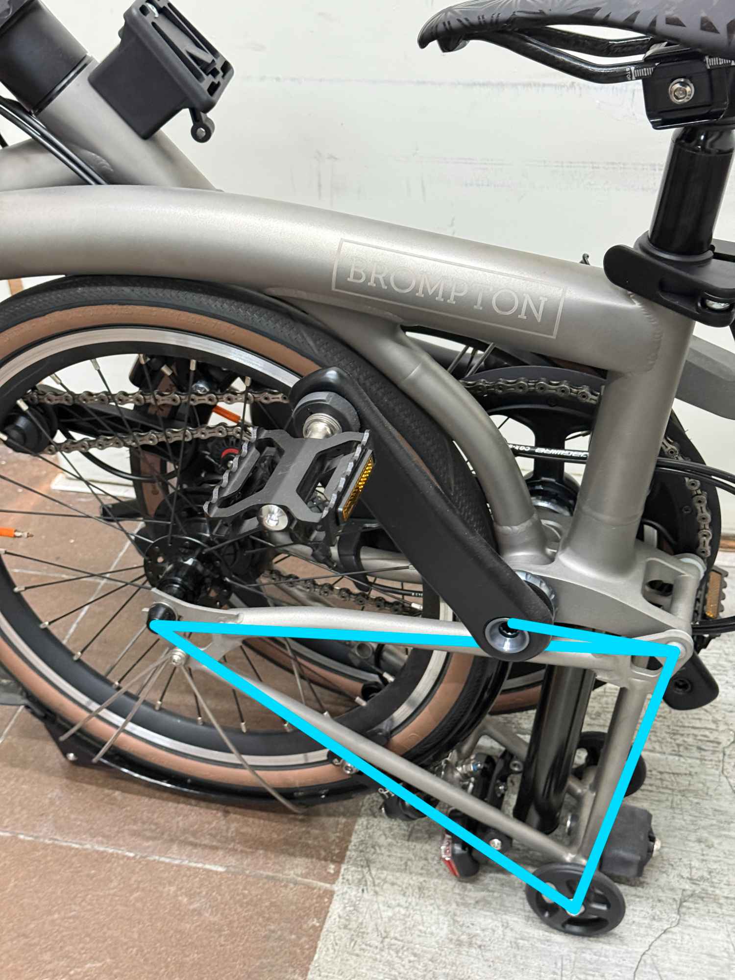 因為採用FM卡鉗規格,就有更多的升級選擇!下圖這是 brompton G Line的後三角,而車上那帥氣的 JuinTECH金色卡鉗與碟盤,這都是發燒車友們的升級傑作