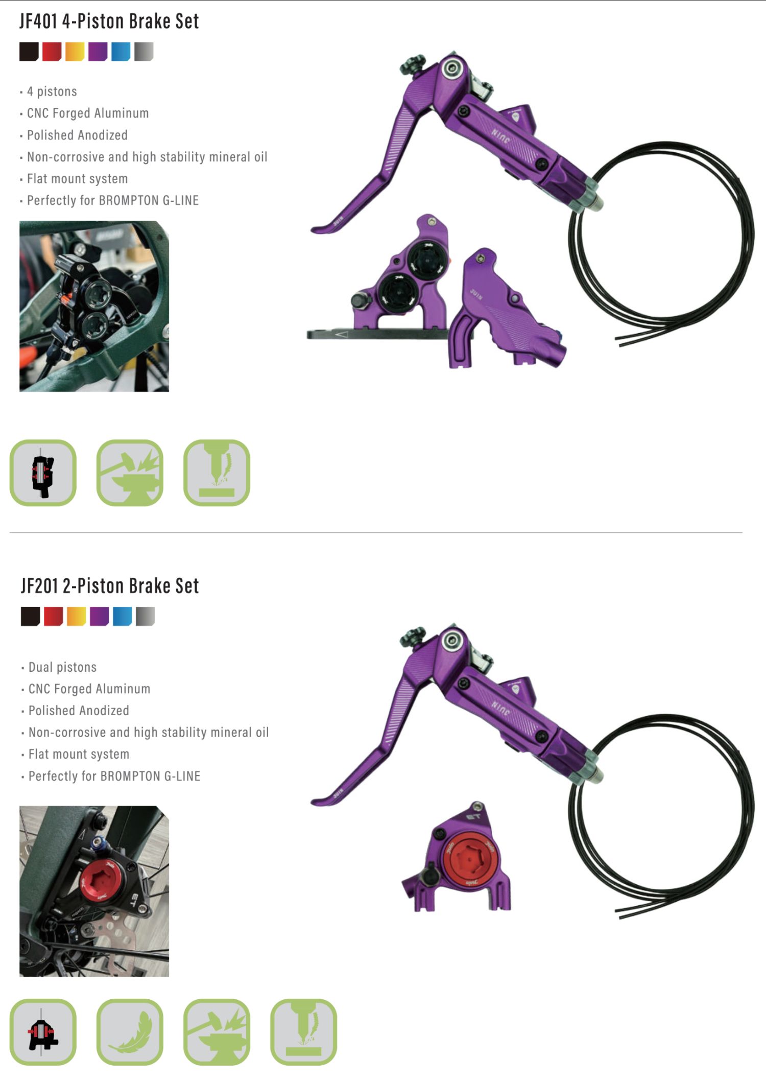 這兩款油壓煞車組都有六個顏色選擇,下方的 JF201是與市面最輕的卡鉗 ETF-A的組合,可以將你的 NEO推向更輕量化的境界喔!