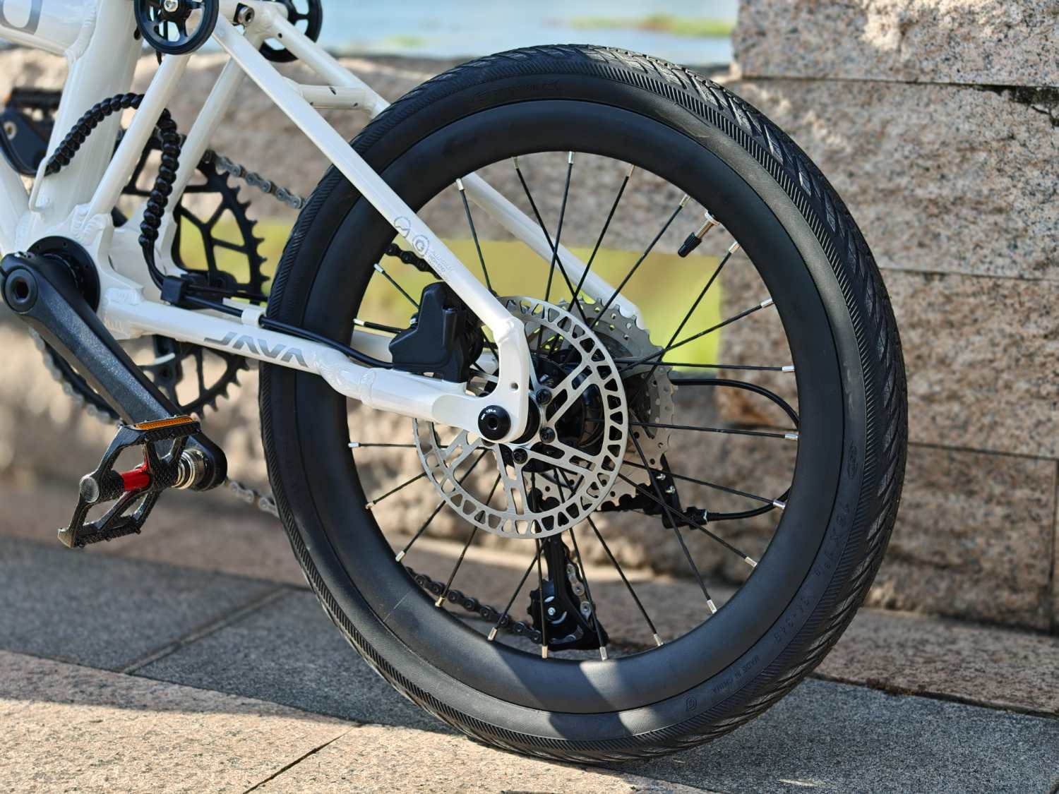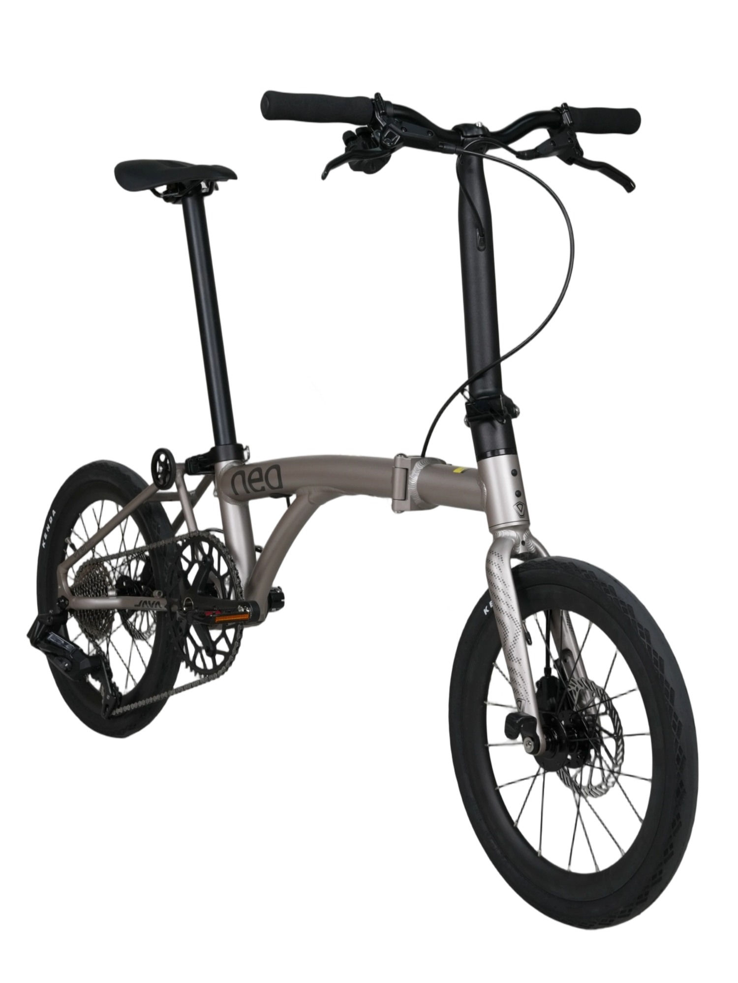JAVA設計師將原本傳統三摺車的後三角結構小轉軸,直接與大盤軸心二合一,以機械結構來說...JAVA NEO的大軸設計會更為比較強壯!