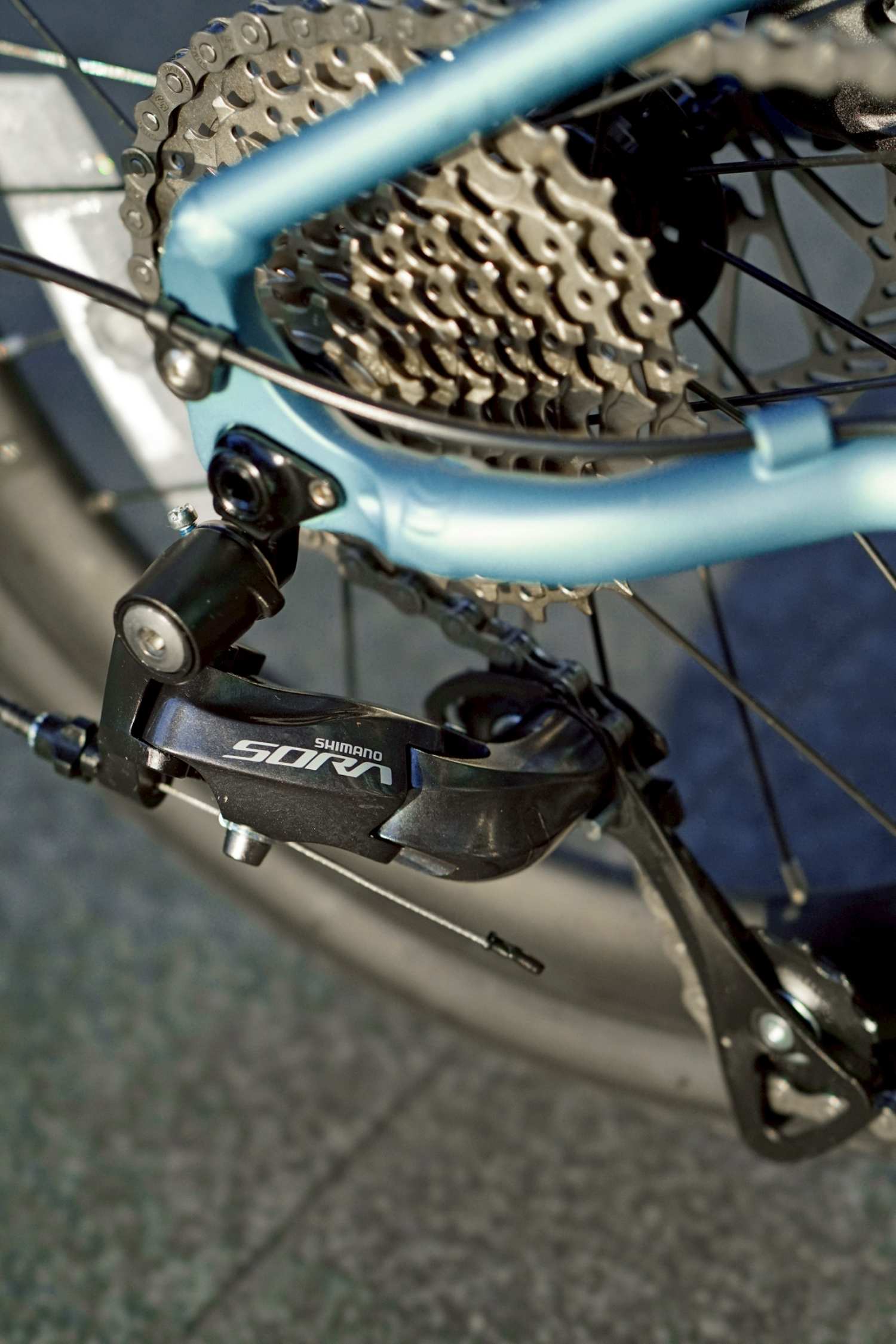或許這車上的後變速器 Shimano SORA(日文為天空的意思),雖然等級並不高,但這可是標準的公路車後變速器,因此改電變不用再裝克難的拉線盒,超讚!
